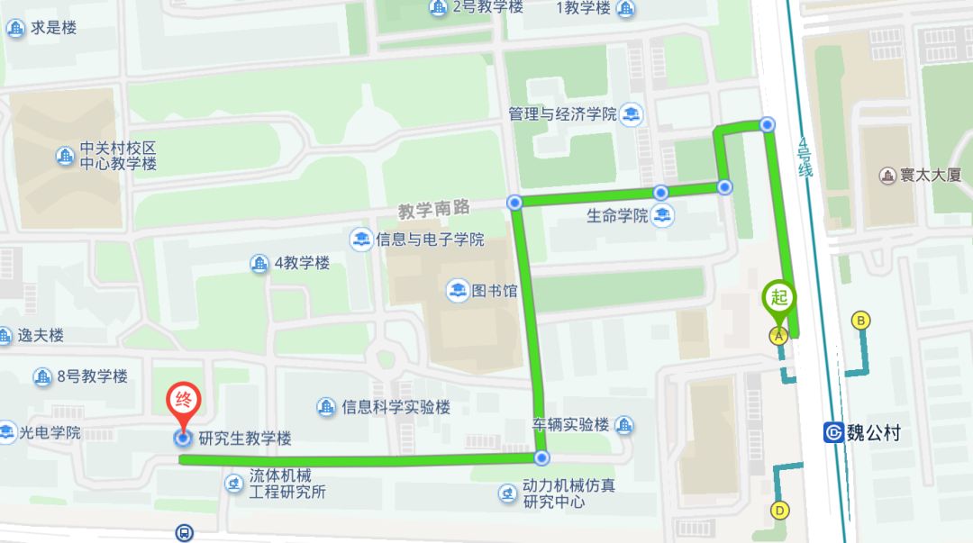 1. 乘坐地铁 4 号线,在魏公村站下车,由 A 口出,从北京理工大学东门进入校园;