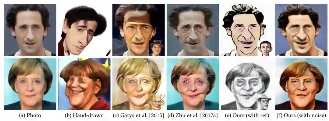 该 CariGAN 允许用户仅通过调参或给出一个示例漫画来控制几何形状与外观风格中的夸张程度。