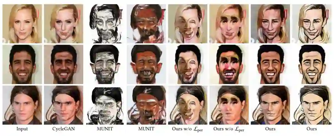 为了构建非成对图像间的关系,CariGeoGAN 和 CariStyGAN 都使用 cycle-consistency 的网络结构,它广泛应用于交叉领域或无监督图像转换任务中。最后,夸张的形状对经过风格迁移的人脸进行变形,从而获得最终的输出结果。