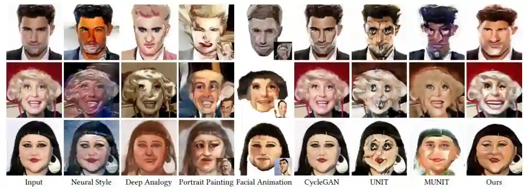 图 16:对比基于深度学习的人脸漫画方法,从左到右分别为两种一般的图像风格迁移方法、两种基于面部特性的风格迁移方法、两种单模型图像转换网络和多模态图像转换网络(MUNIT)。输入图像都选自 CelebA 数据集中,但除去了用于训练的 10K 张图像。
