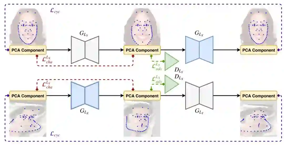 图 4:CariGeoGAN 的架构。它基本上遵循 CycleGAN 的网络结构,cycle Loss 为 L_cyc,对抗损失为 L_gan。但是我们的输入和输出是向量而非图像,我们添加了 characteristic loss L_cha 以增加人物的独特特征。