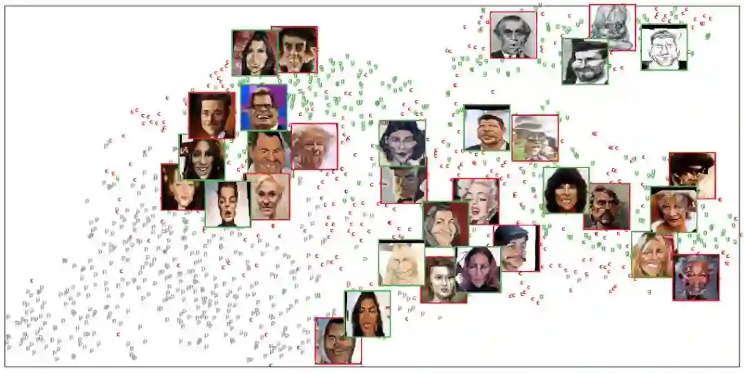 图 12:风格嵌入系统的 T-SNE 可视化。其中灰点表示图像、红点表示手绘的人脸漫画、绿点表示生成的结果。一种不同点所对应的示例图像以对应的色彩框标注出来。