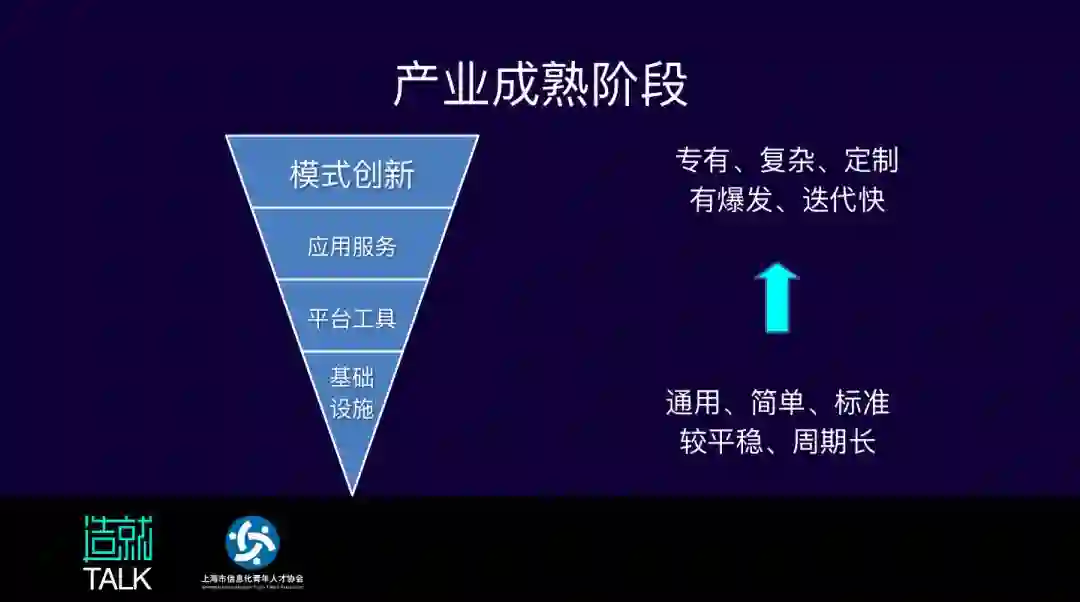 第一步是底层的基础设施,然后是平台工具,只有当应用非常繁荣之后,才会带来模式创新。这是一个从底向上逐渐成熟,逐渐发展的过程,它是一个倒三角形的发展形态,越在底层,相对的存在数量越少。你想想,今天能够成为工具平台,能成为底层基础设施的企业有多少?比如运营商,就三大运营商,比如最好的数据库,就那么几家,但是要做应用服务,毫无疑问,竞争非常激烈,迭代非常快速。