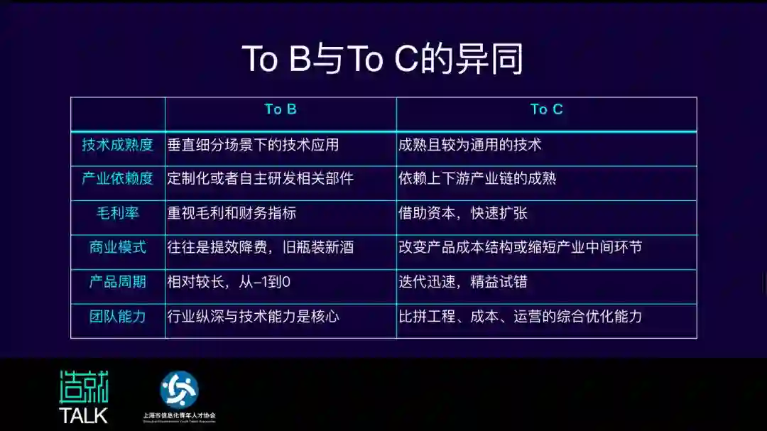 对于to B跟to C,我们往往有一个错觉,会认为如果做to B,应该用最先进的技术,而做to C的话,可能用的是比较便宜的技术。