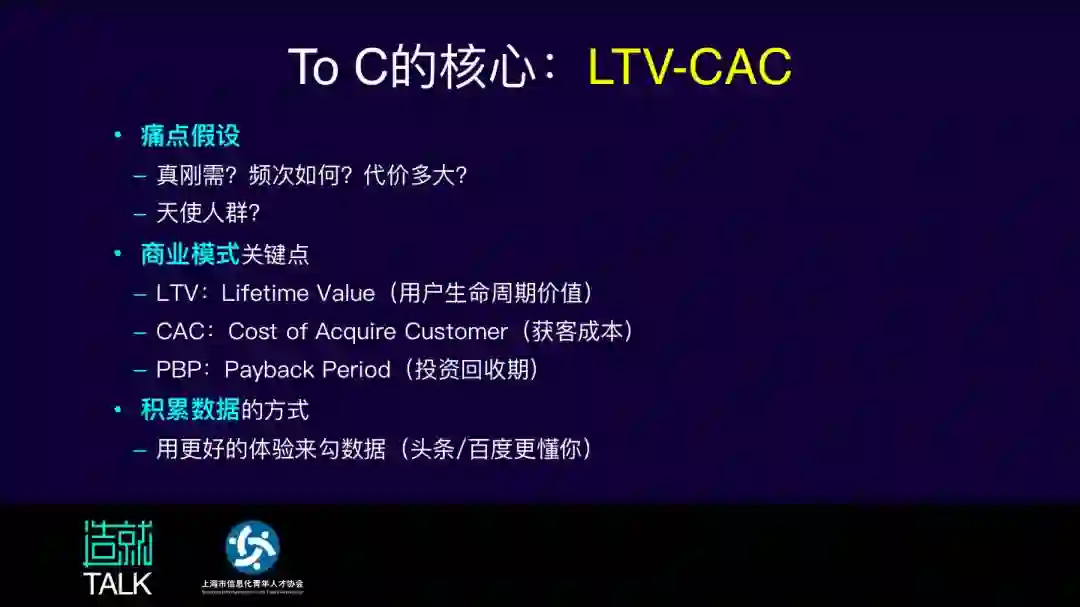 而to C的公司,你要想实现数据的积累,我觉得跟to B有点不一样,我把它描述叫做钩数据,就是数据要非常人性化地让用户主动地交上来,当然前提是你能给用户提供更好的服务和体验。