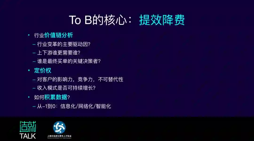 我自己在看了上百个人工智能跟产业结合的项目后,我最后把这一类to B的商业模式总结为七个关键字:提效、降费、定价权。