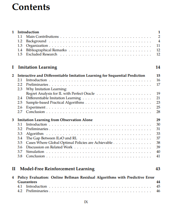 在本文中,我们试图通过引入额外的假设和信息源来获得对RL问题的支持。本文的第一个贡献是通过模仿学习来提高RL样本的复杂度。通过利用专家的示范,模仿学习极大地简化了探索的任务。在本论文中,我们考虑了两种设置:一种是交互式模仿学习设置,即在训练期间专家可以进行查询;另一种是仅通过观察进行模仿学习的设置,在这种设置中,我们只有一组由对专家状态的观察组成的演示(没有记录专家行为)。我们在理论和实践中研究如何模仿专家,以减少样本的复杂性相比,纯RL方法。第二个贡献来自于无模型的强化学习。具体来说,我们通过构建一个从策略评估到无后悔在线学习的总体约简来研究策略评估,无后悔在线学习是一个活跃的研究领域,具有良好的理论基础。这样的约减创造了一个新的算法族,可以在生成过程的非常弱的假设下证明正确的策略评估。在此基础上,对行动空间和参数空间两种无模型勘探策略进行了理论和实证研究。这项工作的第三个贡献来自基于模型的强化学习。我们提供了基于模型的RL方法和一般无模型的RL方法之间的第一个指数样本复度分离。然后,我们提供了基于PAC模型的RL算法,可以同时实现对许多有趣的MDPs的采样效率,如表列MDPs、因子MDPs、Lipschitz连续MDPs、低秩MDPs和线性二次控制。通过将最优控制、模型学习和模仿学习结合在一起,我们还提供了一个更实用的基于模型的RL框架,称为双重策略迭代(DPI)。此外,我们给出了一个通用的收敛分析,将现有的近似策略迭代理论推广到DPI。DPI对最近成功的实用RL算法如ExIt和AlphaGo Zero进行了概括和提供了第一个理论基础[Anthony et al., 2017, Silver et al., 2017],并为统一基于模型的RL方法和无模型的RL方法提供了一种理论健全和实践高效的方法。