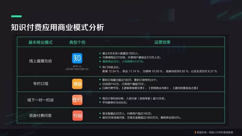 阿里应用分发还总结了各大知识付费平台在不同商业模式方面的成果。而作为线上直播互动模式的典型代表,知乎Live的付费课程复购率达42%,人均消费43.67元,这也与直播转瞬即逝的特点不无关系。