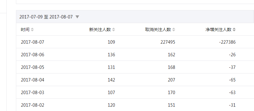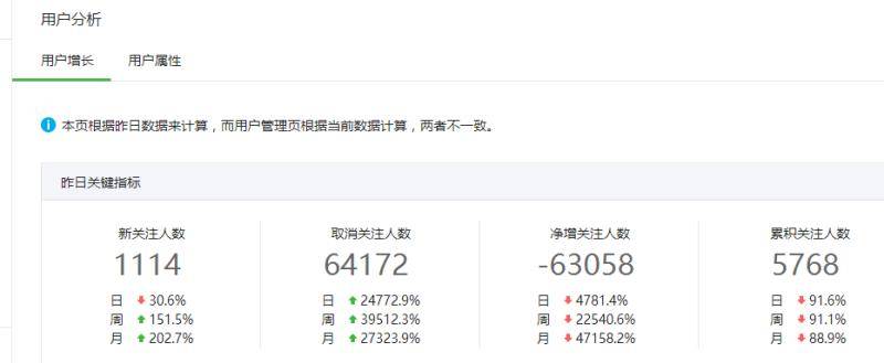 新榜向微信官方求证并获得回复称,今晨,微信公众平台后台“用户分析”中,出现取关人数统计异常,目前正在紧急修复中。