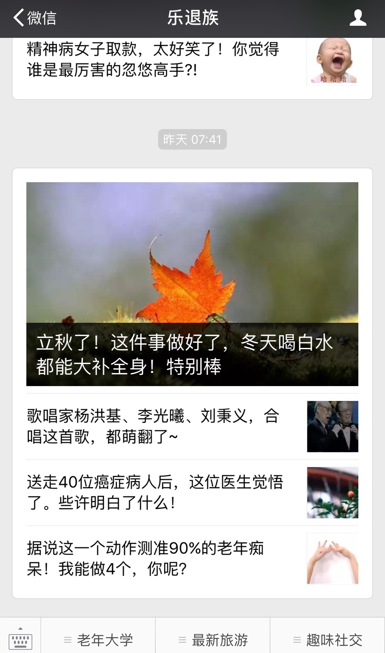 新榜讯 今天有用户向榜妹爆料,订阅号“乐退族”突然从订阅号列表跳到了聊天页面。该用户的微信是iOS的6.5.13版本。目前尚不清楚是系统bug还是新功能测试。