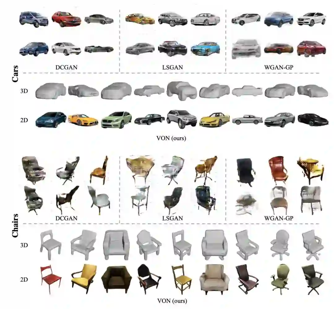 为了评估图像生成模型,团队计算了用于生成三维模型的Fréchet初始距离 。此外,他们还向亚马逊的Mechanical Turk上展示了200对由VON和最先进的模型生成的图像,被试者的任务是在每对图像中选择更加真实的结果。