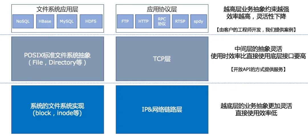 问题是我们必须时刻知道,目前我们在不同层次的这些模块存在哪些问题,以及不同层次在解决什么问题。比如说上述的操作系统中文件系统和协议分层中,最底层的是跟硬件打交道,能够精准的控制硬件,中间是对操作系统的用户暴露的,更简单易用,上层是针对应用来使用,解决特定领域的问题,不同的层次做了不同的抽象,也是在解决不同的问题。