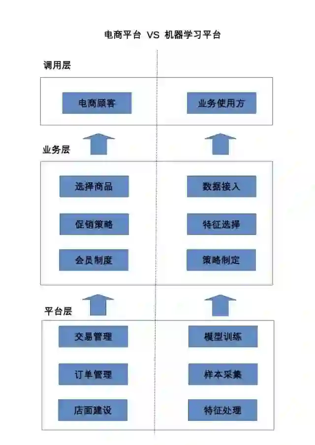 那么平台化是如何解决这些问题的呢?回答这个问题之前,需要先了解在平台的模式下一个完整的机器学习流程是怎样的。为了方便理解,我们可以使用电商平台(例如天猫、京东等)的例子来做类比。想要使用机器学习技术的业务方可以看做是想要在电商平台上开店的小商家,而机器学习平台无疑就是电商平台了。作为一个商家,如果选择自己建网站开店,就好比每个业务自己搭建机器学习流程,显然是一个低效的选择。如果在电商平台上开店,平台会提供支付、订单管理、库存管理、店面建设、促销管理等等核心的功能,也就是“电子商务”中“电子”的部分。而商家需要负责的,就是“电子商务”中“商务”的部分,也就是和自己业务核心相关的部分,例如选择销售什么样的商品,决定使用什么样的促销策略,如何建设会员制度等等,而这其中的大部分,商家也不需要自己搭建实现,只需要通过平台提供的工具将自己的想法进行落地即可。