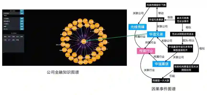 事理逻辑的挖掘,可以分成基于显式因果逻辑的挖掘和隐式因果逻辑的逻辑两种。前者通过人工设定因果模式可以获取大量的因果事件对,例如对于句子“受范冰冰阴阳合同事件牵连,唐德影视、华谊兄弟开盘大跌”,可以结构化出<范冰冰阴阳合同事件,导致,唐德影视、华谊兄弟开盘大跌>这样的因果事件对。通过对原因事件和结果事件进行进一步解析,我们可以得到原因事件的关联主体是人物,即影视明星“范冰冰”,事件的动作是“阴阳合同”,结果事件中关联的主体是两家传媒上市公司,华德影视和华谊兄弟,事件的动作是股价大跌。结合上下文,可进一步明确事件发生的时间信息,为2018年6月4日。对这样的事件对,可进一步抽象泛化成一种逻辑规则,即影视明星“阴阳合同->传媒公司股价下跌”这样一条因果模式链。更进一步,通过对动作本身的情感极性进行泛化,我们可以发现,“阴阳合同”属于负面消息,股价下跌这一事件属于负面影响,因此,可以进一步泛化成“明星负面消息->公司利空”这条更为抽象的因果模式链。这样,通过大量的显示模式对事理逻辑进行结构化,对不同来源的事理知识进行融合并层层抽象,可以得到大规模不同层级的事理逻辑,借助知识图谱首尾相接的方式,我们对构建好的一条条事理逻辑进行链接,就形成了一个图谱形式的事理逻辑脉络,即事理图谱。