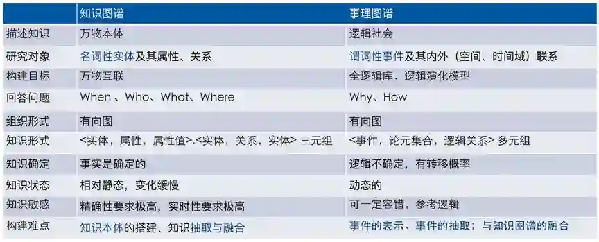 与知识图谱的组织形式相仿,实体通过头尾相连,可以组织形成图谱状的知识图谱,事理采用类似的组织方式,可以形成事理图谱。知识图谱与事理图谱两者之间存在着诸多异同之处,我们在参考前人的工作上,结合自己的研究工作,从描述知识、研究对象、构建目标、知识形式等共10个方面进行了总结,如图6所示: