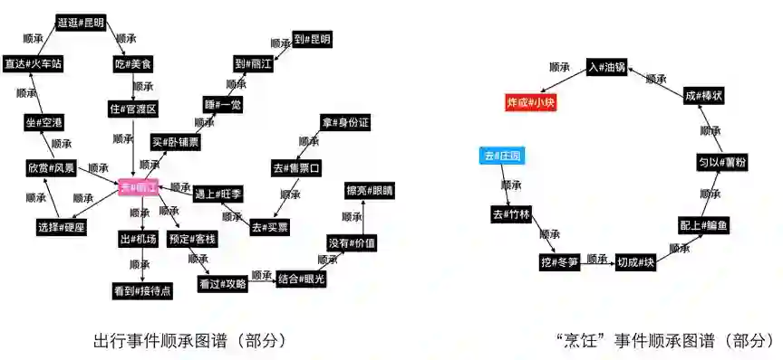 图10分别是部分“出行”和“烹饪”两个顺承子图谱。从中我们看到,围绕着“去丽江”这一事件所产生的顺承逻辑,如“拿#身份证”->“去#售票口”-> “去#买票”->“遇上#旺季”->“去#丽江”这一顺承逻辑,“去#丽江”-> “预订#客栈”->“看过#攻略”->“结合#眼光”->“没有#价值”->“擦亮#眼睛”这一顺承逻辑结构。“去#庄园”->“去#竹林”->“挖#冬笋”->“切成#块”->“配上#鳊鱼”-> “匀以#薯粉”->“成#棒状”->“入#油锅”->“炸成#小块”这一顺承事件链形象地描述了“烹饪”这一事件的时序关系。这种顺承事理逻辑在揭示叙述性与步骤型事务的刻画上是一种很好的形式。