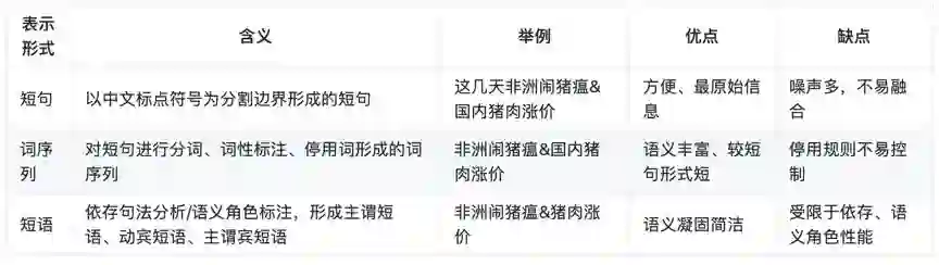 说到事理图谱,就不得不说事件表示。事件表示是事理图谱中的重要问题之一,目前学界和业界正在寻求一种尽可能灵活、简单的方式去表示事件。在事件表示上,有上海大学刘宗田老师团队提出的“事件六要素本体模型”[5],即将事件建模成e = { A,O,T,V,P,L}的表示形式, 其中: A 为动作要素; O 为对象要素; T 为时间要素; V 为环境要素; P 为断言要素; L 为语言表现。 而这种表示方式无法直接用于图谱节点表示,更可能成为一种事件描述信息隐藏于图谱事件节点背后。我们在实际的工作当中,尝试了几种事件表示方式,如含义、举例、优缺点如图9所示: