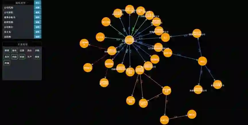 公司金融领域研究的核心对象,公司作为金融中的重要角色,构建起公司知识全景图谱对于进一步知识整合、公司监测、公司运营等具有显著作用。我们以A股上市公司为基本数据来源和研究对象,构建起涵盖公司、行业、板块、人物、原料、产品等共17类实体,并购、竞争、供应、投资等共16类实体关系,规模达百万级的A股上市公司知识图谱,如下图3所示: