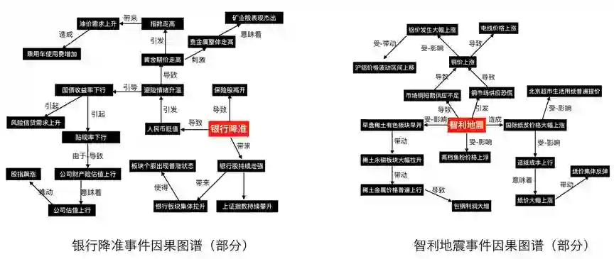 银行降准会导致保险股高开、银行股持续走强,银行股持续走强先后带来银行板块集体拉升、板块个股出现普涨状态等结果。在“智利地震”这一事件因果事理图谱中,我们可以看到受波及的一些列后续事件,如高档鱼粉价格上浮、早盘稀土板块高开、国际纸浆价格大幅上涨等事件,这些事件又进一步传导,最终导致之家集体反弹、北京生活用纸普遍提价、沪铝价格波动区间上移等结果。这些因果逻辑在普通人看来,并不能立刻想到,相反的,只有具有专业背景的人员才能有这种逻辑推导思维。如此看来,事理图谱对于这类专业的逻辑链条可以进行良好的组织和刻画。