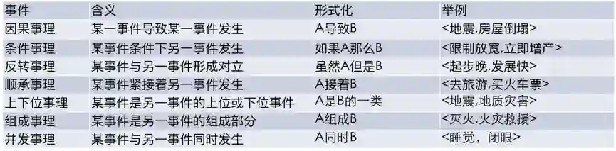 因果事理描述的是认知体系中的一种前因后果联系,前面一个事件会导致后面一事件的发生;条件事理描述的是认知体系中的一种条件结果关系,是一种预设与结果逻辑;反转事理往往描述的是认知体系中的一种互斥逻辑,是一种真假值逻辑;顺承事理描述的认知体系中的一种时间上的偏序关系,是一种先后动作逻辑;组成事理,刻画的是事件之间整体与部分的逻辑;上下位事理,描述的是事件在分类体系中一种逻辑;并发事理,描述的是事件在时间上的一种共生关系,指一个事件发生下另一个事件一定发生;