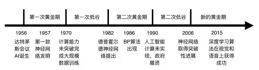 当前人工智能时代下,机器与人类之间的博弈一直在进行着。如图1所示,从1926年达特茅斯会议的召开标志人工智能诞生到深度学习模型在若干人工智能领域大规模应用的如今,人工智能已经走过近60年的时间。人工智能的发展先后经历了两次黄金期以及两次低谷。1957年第一款神经网络的发明点燃了第一次人工智能的高潮,而随后在20世纪70年代,受限于当时的运算资源,并不能完成大规模的数据训练,人工智能一度陷入低谷,直到1982年德普摩尔神经网络的提出以及BP算法的出现使得大规模神经网络训练成为可能后,人工智能才逐渐缓过神来,并提出了全面实现人工智能计算机的目标,掀起了第二个黄金时期。但直到21世纪初,人工智能计算机并未实现以及政府的撤资,又一次将人工智能拉入低谷。随后,在2006年深度学习神经网络取得突破性进展,一直到2015年深度学习算法在语音和视觉识别上取得的成功,再次引领了以深度学习为主流的人工智能时代第三个黄金期。