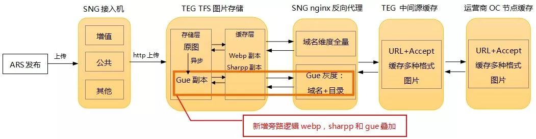 因此,最终落地方案设计时,没有对是否叠加压缩进行强制限制。即Guetzli与原有压缩访问架构在源站并行部署,各自覆盖对应适用场景并且有一定几率叠加使用。最终落地方案架构如图所示: