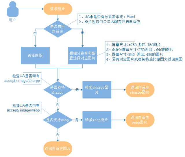 终端机型分辨率大小不一,相关图片是以最大分辨率设计的,目前统一标准是750px,但许多中低端机型并不需要高分辨率的图片,如果能按需返回适当分辨率图,同样可达到节约流量及优化性能的目的。经现网验证,启用自适应图片压缩后,相关产品访问流量可在原有基础上,再节约20%左右。