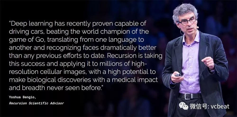 作为Recursion Pharmaceuticals的科学指导之一,Yoshua Bengio博士曾说过:“Recursion利用深度学习探究了数百万个高分辨率细胞图像,它们所具备的潜力和影响足以促进医学广度下从未见过的生物发掘。”