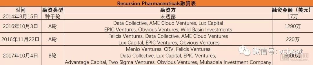 2017年10月,Recursion Pharmaceuticals获6000万美元B轮投资,投资方分包括以Data Collective带头的10家风投企业。