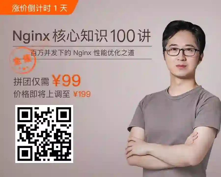 也因为,内容质量和数量过硬,现官方正在涨价,原价 ¥129 涨价至 ¥199,现《Nginx 核心知识 100 讲》特惠参团只需 ¥99,立省 ¥100。如果你想学好学会掌握 Nginx,这个课程,真的十分推荐。