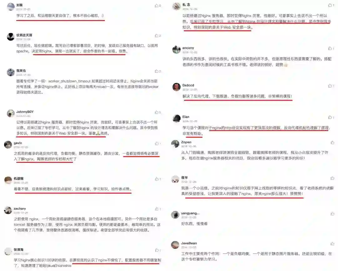更值得一提的是,这位大佬还在极客时间开了一个视频课程 ——《Nginx 核心知识 100 讲》,已经有超过 1.8+ 万人加入学习了,评价都非常不错。