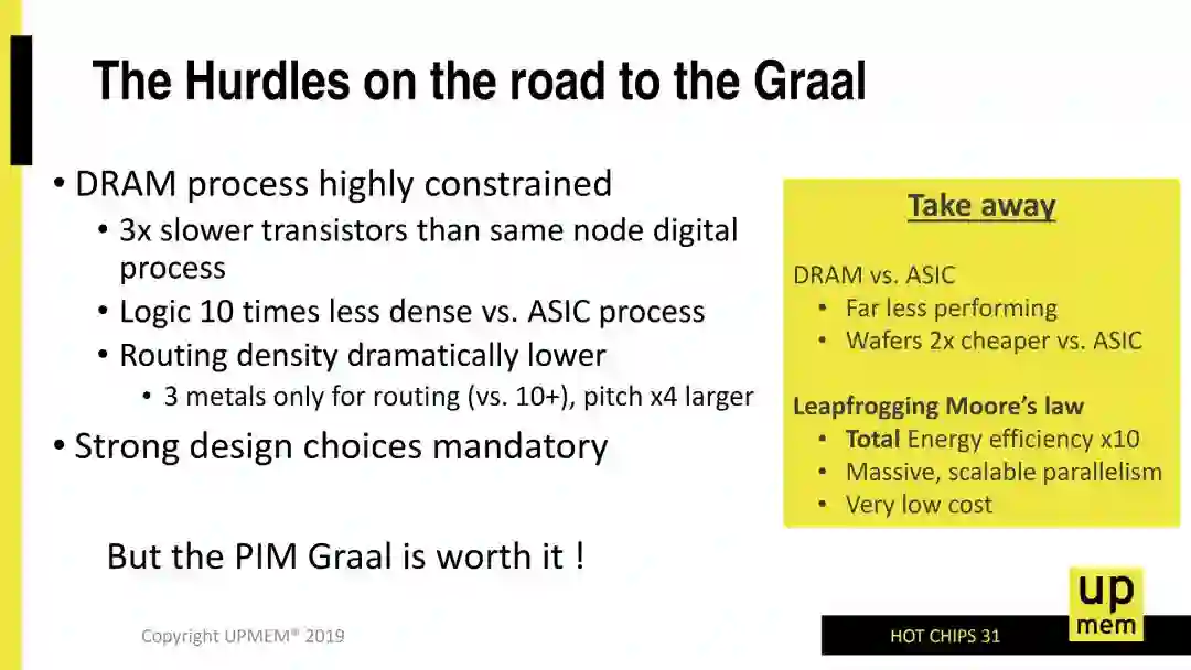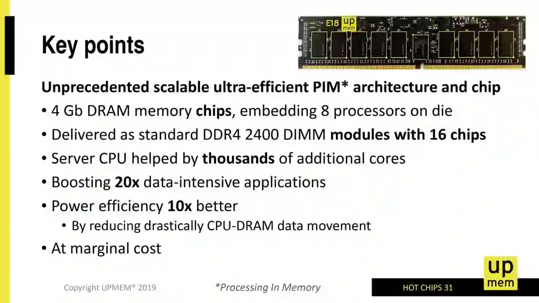 在这次的会议上,一个初创公司upmem,虽然自称是PIM,但实际走的是近存储计算的路线。upmem的产品看起来和传统的DRAM颗粒和DIMM没有什么区别,但在每个4Gb DRAM颗粒里嵌入了8个处理器核。