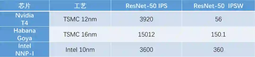 从指标来看,目前比较容易对比的主要是云端inference芯片,Nvidia的T4,Habana的Goya,Intel的NNP-I,都有ResNet-50的IPS(Image Per Second)和IPSW(IPS/W)数据。