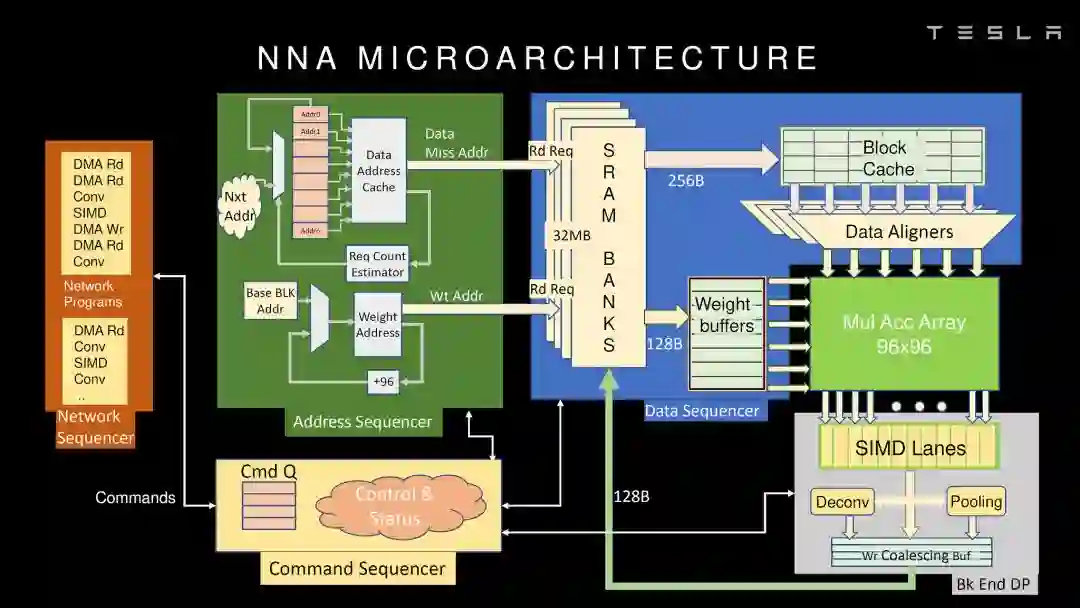应该说,Tesla的NNA不管从指令集还是微架构都和Google TPU(公开的第一代)非常类似,MAC矩阵实现卷积和矩阵乘,SIMD实现其它运算,再加一些特殊运算的硬件加速。这种架构应该是目前看到最多的设计,简单直接,硬件实现比较容易,挑战是MAC矩阵的使用效率。当然,在很多细节上,Tesla的NNA还是做了不少优化。如我之前的文章的分析,Tesla的芯片完全是自用的,合适就好,没有太多可比性(多角度解析Tesla FSD自动驾驶芯片)。