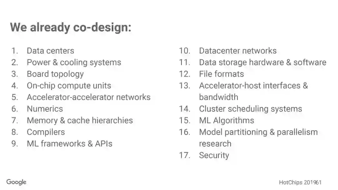 第三,软硬件协同设计还是有很大空间。在DaVinci的例子里,即使硬件支持不同粒度的运算,在实际网络怎么用好这些硬件也还是非常困难的课题。最近我讨论这个话题也比较多(AI芯片“软硬件协同设计”的理想与实践)。其实这次Hot Chips上Google的tutorial就是“Cloud TPU: Codesigning Architecture and Infrastructure”。这里并没有太多的介绍TPU架构,而是把重心放在了协同设计上,其的内容也远远超出了NN加速本身。从这里也可以看出,未来的协同设计不仅仅是NN加速器这一个点,而在“高手过招”当中,必须要完整考虑整个系统的优化。