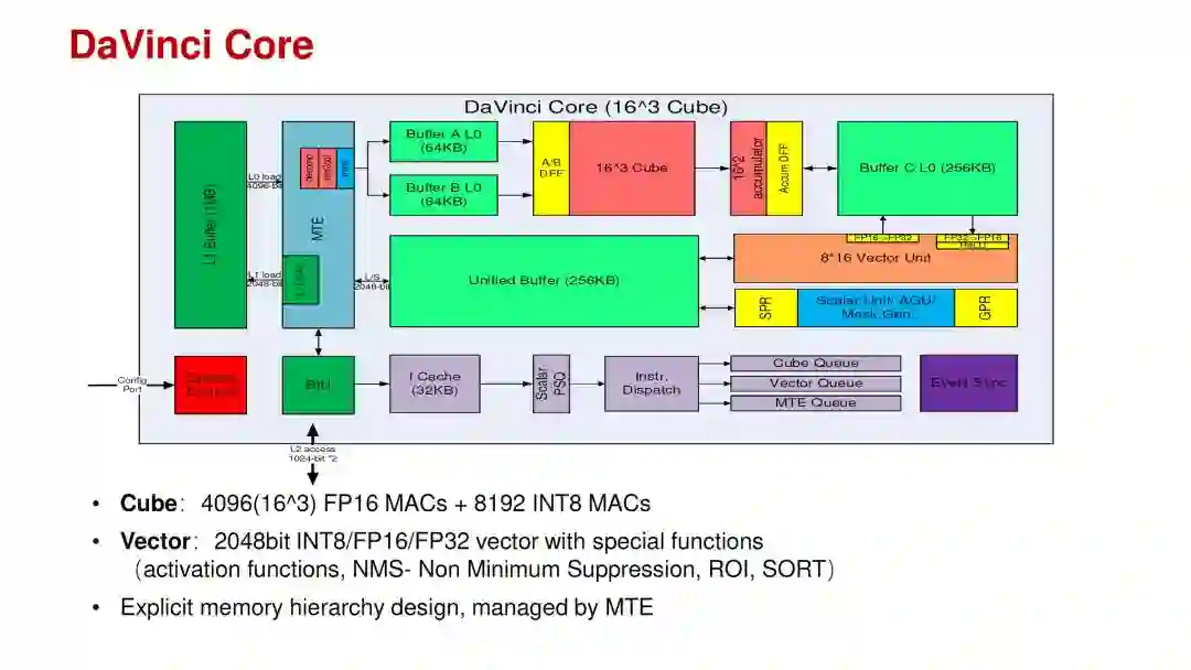 相比之下,华为的DaVinci Core应该是结合了这几年的AI芯片经验和深入的思考。其特点是在一个Core里面同时支持3D(Cube),2D(Vector)和1D(Scalar)的运算,以适应不同网络和不同层的运算分布的变化。当然,把各种运算架构放在一个Core里面并不是特别困难的事情,更难的是设计参数的选择,运算和存储的比例,软件mapping工具等等。这些问题在华为的talk里也给出了一些分析。