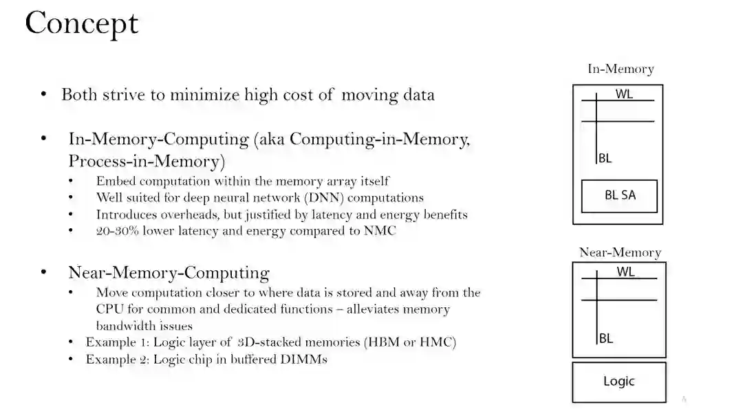 其中In-Memory的意思是直接使用存储单元阵列来做计算,一般是模拟方式,通过AD/DA和数字逻辑部分交互。而Near-Memory则是尽量把运算逻辑(处理器或者加速器)放在离存储单元比较近的地方。