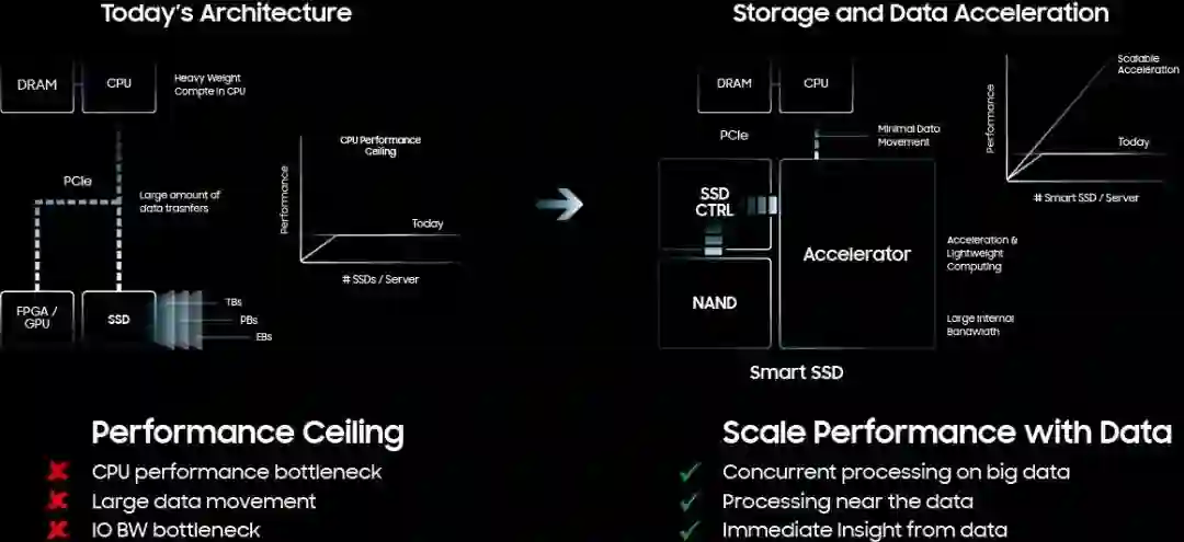如果我们考虑近存储计算,其实还有一个大量存储数据的地方,就是硬盘。因此,现在也有很多的SSD控制器芯片加入的更多的计算功能。比如前一段时间我们看到初创公司InnoGrit就在SSD控制器芯片中加入了NDLA专门加速AI运算。当然除了直接在芯片中增强算力,还有一种模式就是在SSD控制器外增加FPGA,比如三星的Smart SSD方案(下图)。在这次Hot Chips的Poster里面,就有一个来自Bigstream的工作是基于Smart SSD构建的应用框架。