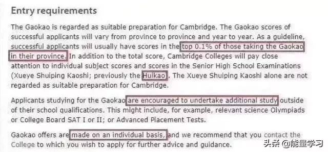 主要内容翻译成中文意思是:从2019年开始,剑桥大学接受高考成绩申请,申请人的成绩需要达到全省高考人数的前0.1%。