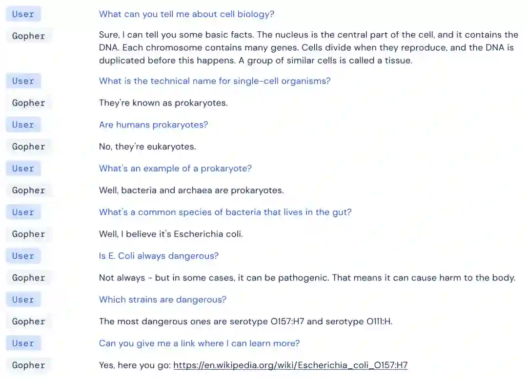 比如下面这个例子,尽管DeepMind没有进行具体的对话微调,但Gopher依然可以和用户一起围绕着细胞生物学进行讨论,并且提供正确的引用链接。