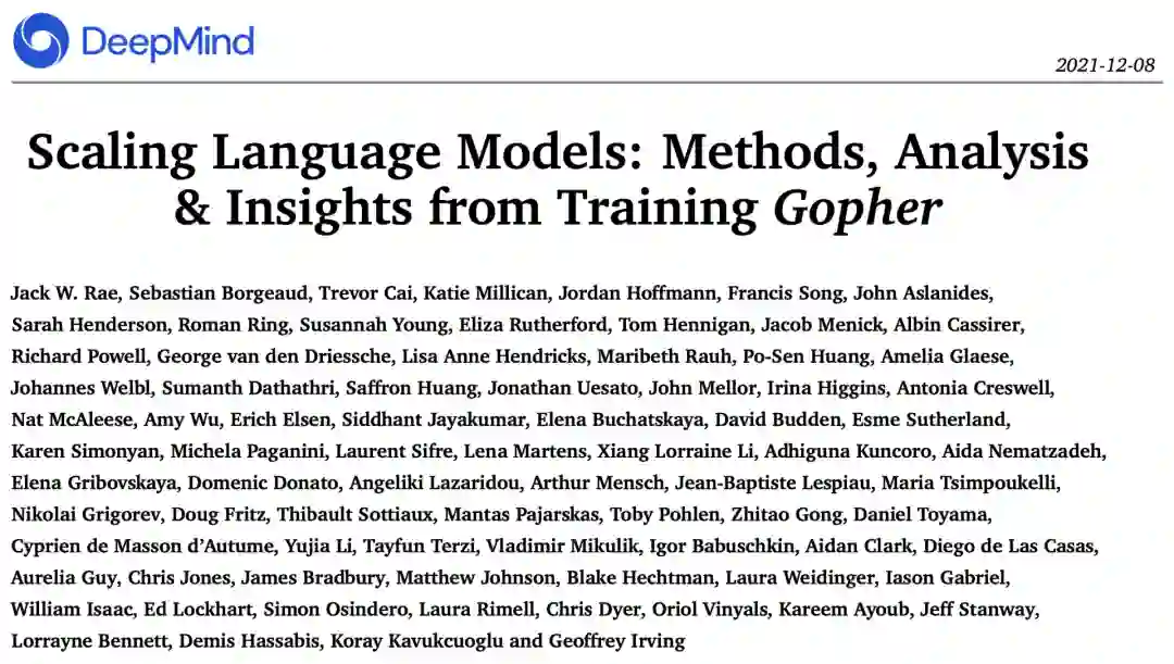 DeepMind的首个大规模语言模型并没有以参数量取胜,只有「区区」2800亿,甚至还没到拥有1.6万亿参数的谷歌Switch Transformer的零头。