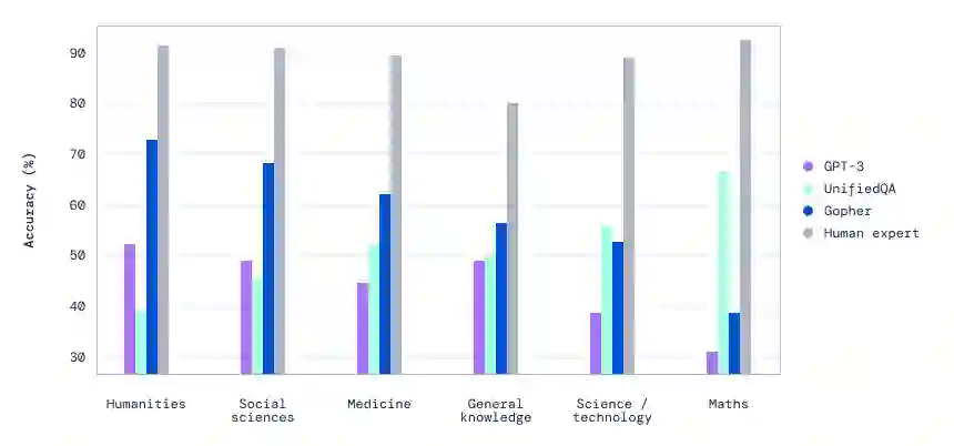 在大规模多任务语言理解(MMLU)的基准中,可以看到Gopher带来的性能提升比以前的研究成果都要显著。
