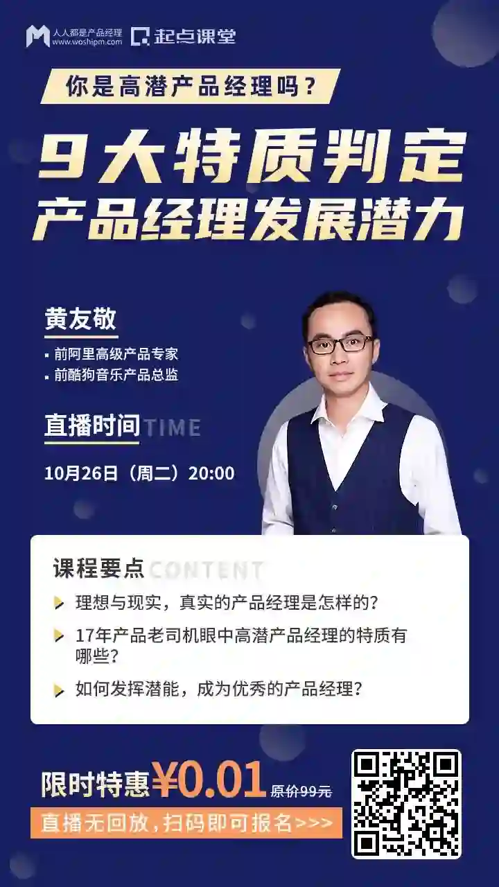 本次授课老师为@黄友敬老师,具有17年互联网产品策划与管理经验,现任职妈妈网产品副总裁,历任阿里高级产品专家、酷狗音乐产品总监等岗位。