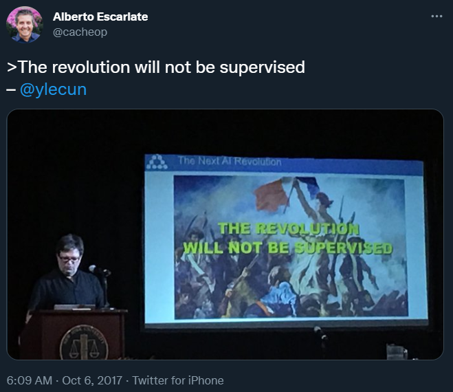 Yann LeCun 在演讲时曾经放过一张法国大革命时期的著名画作《自由引导人民》,并配文:「这场革命将是无监督的(THE REVOLUTION WILL NOT BE SUPERVISED)」。