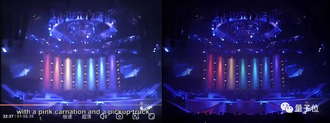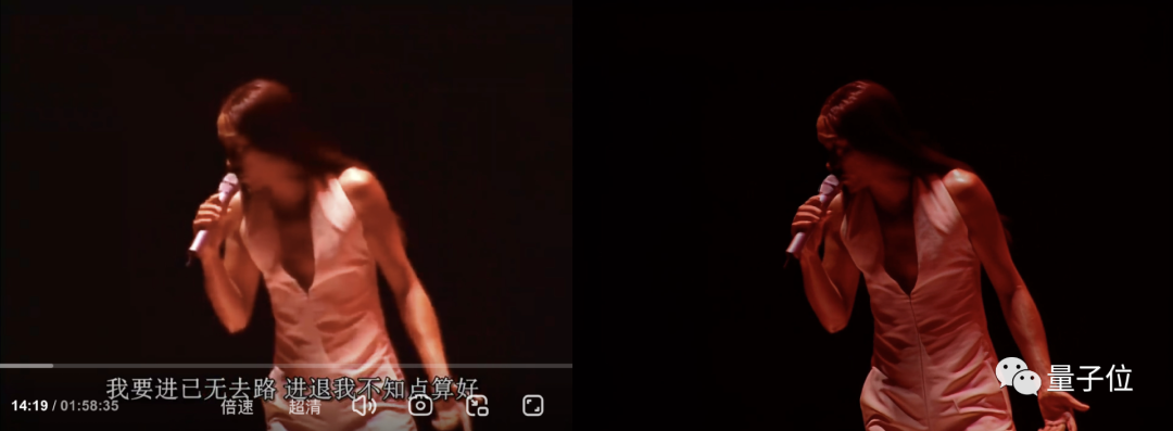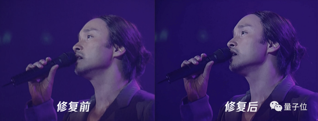 可以看到前后对比明显,修复后的张国荣脸部、舞台等细节清晰可见。