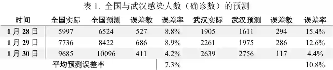 然后,团队根据28-30日的实际情况每日检验模型预测有效性。结果显示:模型预测确诊数的误差率分别为7.3%(全国)和10.8%(武汉)。证明模型对未来24小时的确诊数预测较准确。