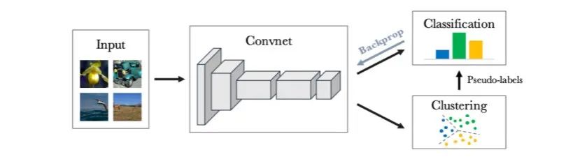 Deep clustering[6]是第一个成功的深度自监督聚类方法(见图 5),该方法包含两个步骤:第一步,将所有训练数据通过深度模型推理得到特征表示,在特征空间中使用K-means方法将每个样本划分到一个聚类中,其所属聚类即为该样本对应的标签;第二步,基于上一步产生的伪标签重新训练深度模型。这两个步骤交替迭代。为了防止收敛至退化解,文中提出两个关键的启发式方案:第一,固定聚类中心个数,如果在聚类过程中某一聚类变为空,就随机选取其余聚类的中心(加上小的随机扰动)来代替空聚类;第二,如果某个聚类中包含的样本过多,那么它所对应的梯度会主导整个网络的参数学习。为了避免这个问题,作者在模型训练梯度回传时会根据聚类大小调整梯度回传量,平衡不同类别样本之间的数量差异。