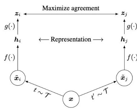 SimCLR 是一个非常简洁的自监督学习框架。它没有建立类似MoCo的键值字典的方式,而是直接在每个batch中的样本之间进行比较学习。对于