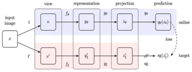 基于这一发现,作者构建了只需要正样本对的BYOL学习框架。如图 4所示,一张输入图片经过不同数据增强后的两个视图分别经过online和target两个分支的backbone和projection head后得到输出