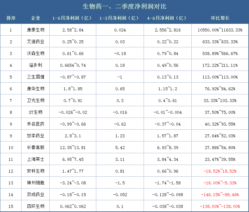 125家药企半年报预告出炉,康泰生物Q2环比100倍增长